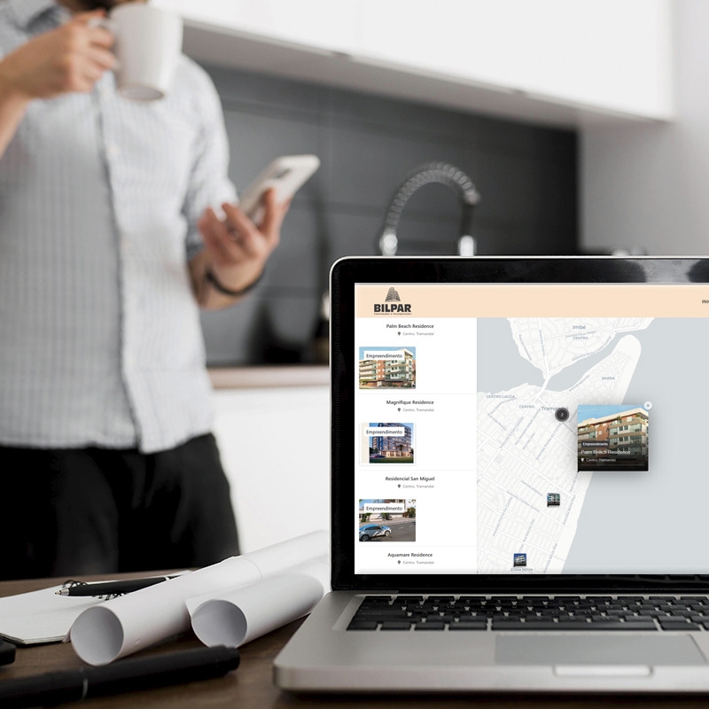 Essa visualização facilita o entendimento geográfico do portfólio da construtora, mostrando regiões de atuação, áreas de expansão e o posicionamento estratégico de cada projeto. Com o mapa, o cliente navega com facilidade, descobre opções próximas ao seu interesse e entende rapidamente o valor de cada localização.